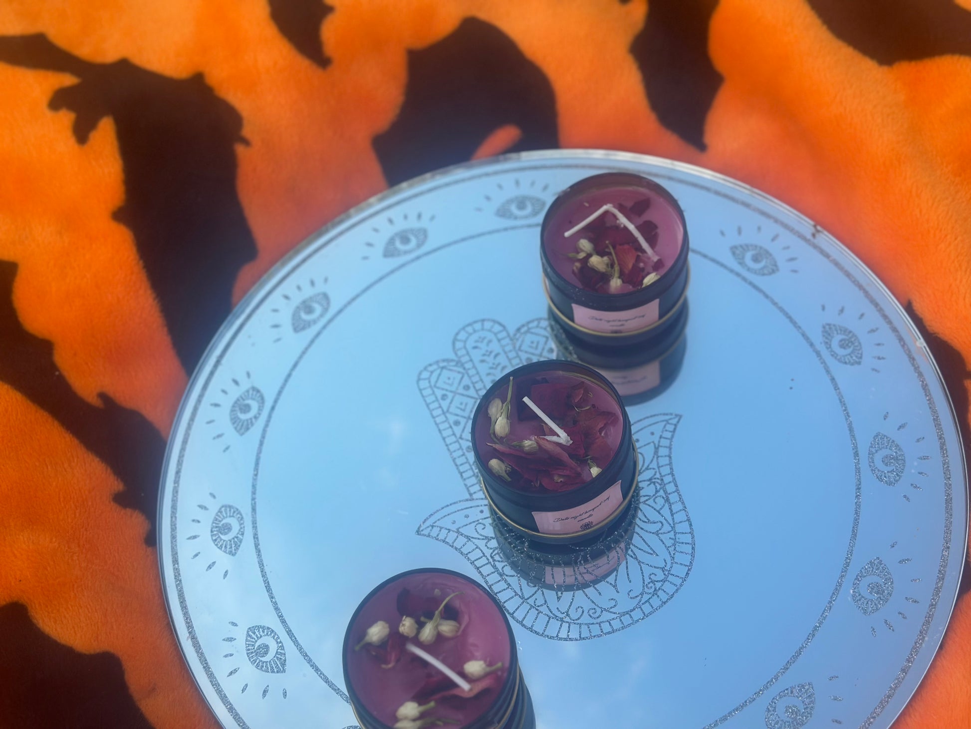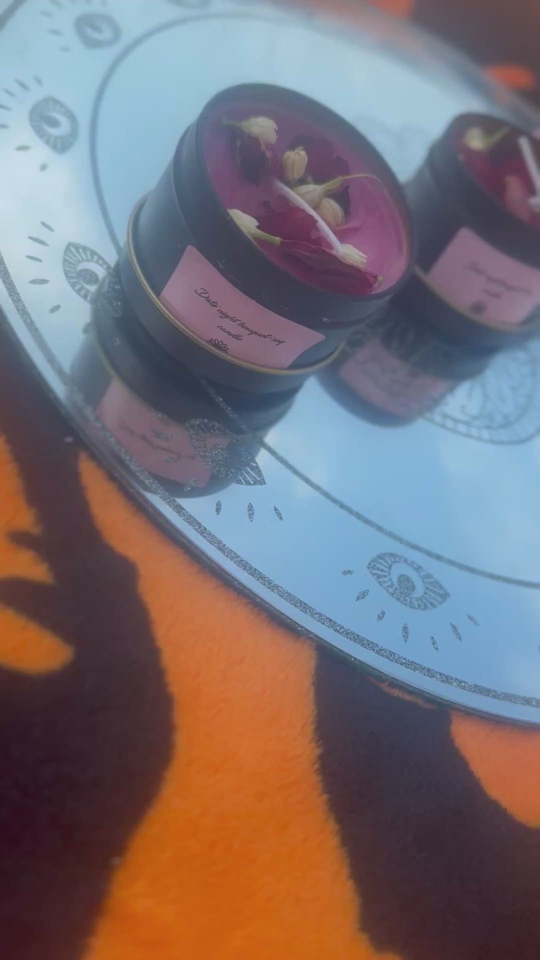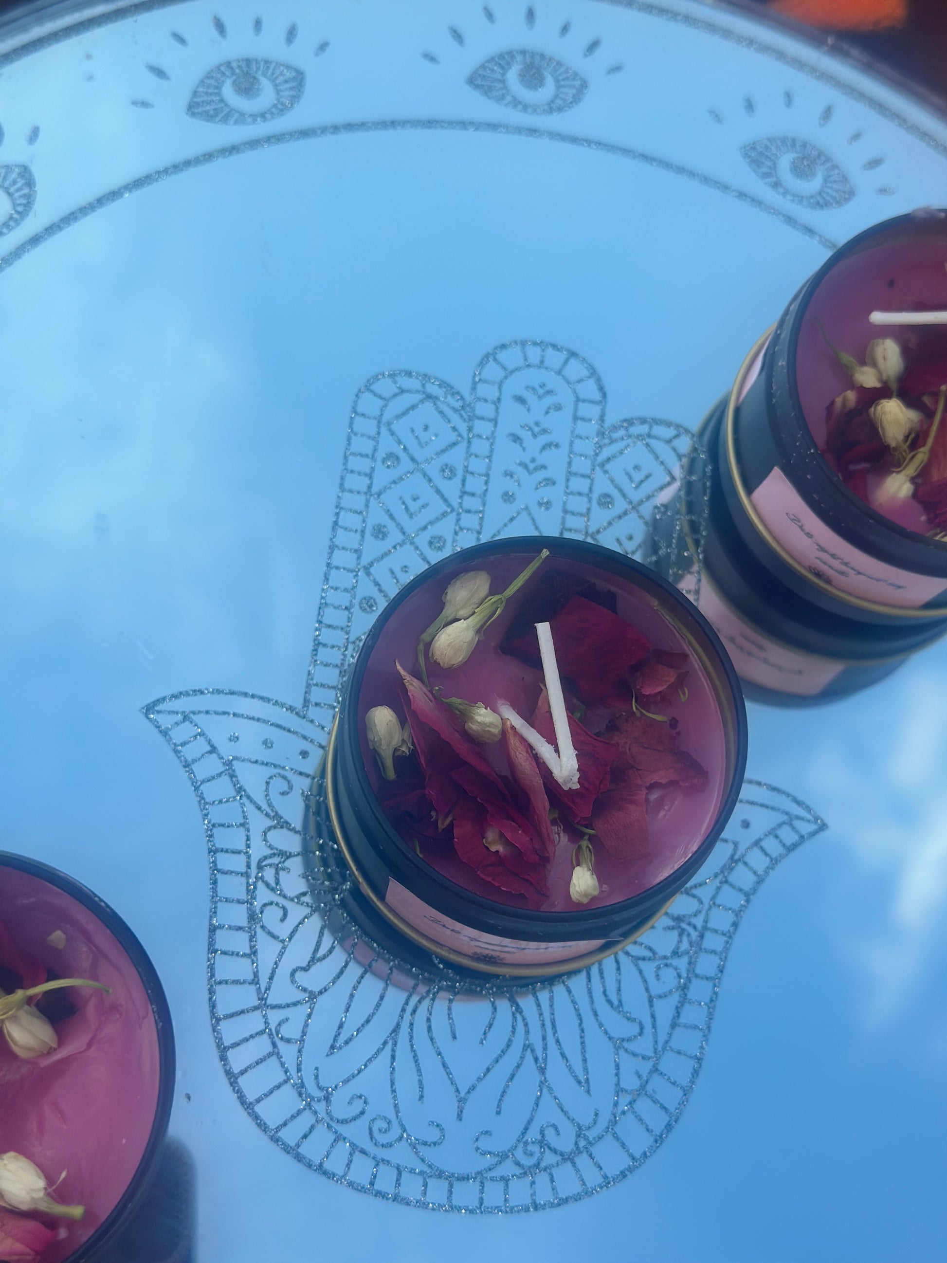 Ingredients: soy wax,rose essential oil,lavender essential oil,jasmine essential oil,pink coloring powder,dried rose petals,dried jasmine petals